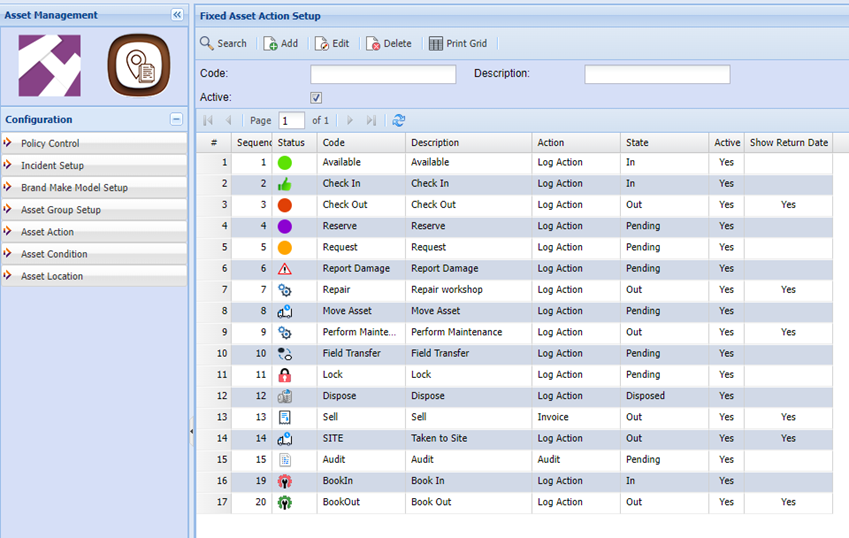 Then click add and the screen below will appear. To edit an asset action, highlight the asset action you want to edit then click edit
