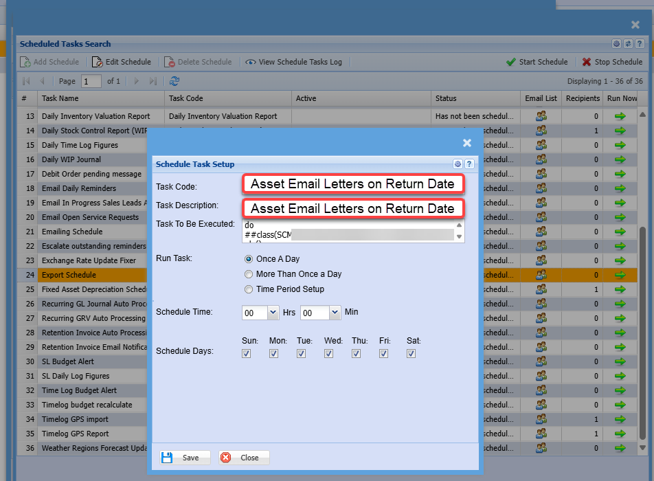 Setup a new schedule to run checks on due letters that are active on assets that are in an out status and have a return date.
