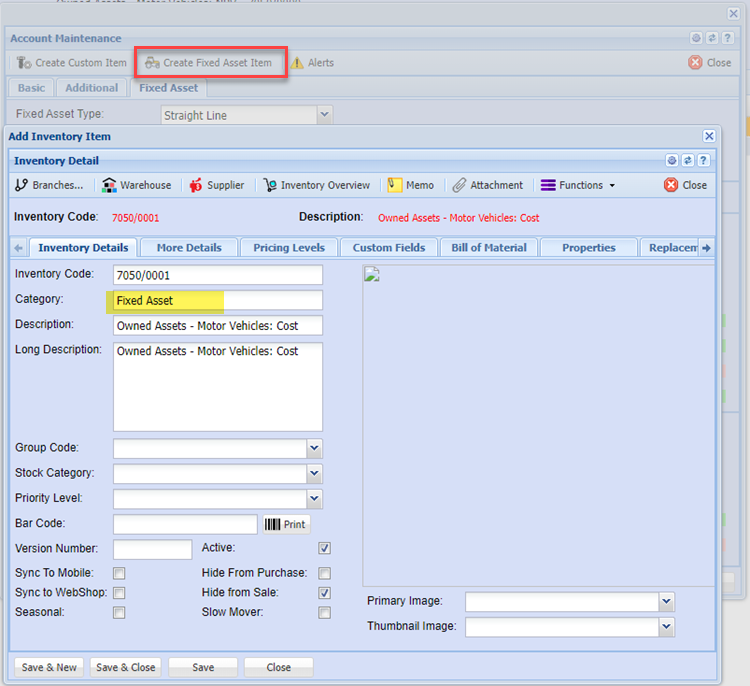 Create the fixed asset inventory item