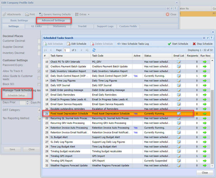 Check that Fixed Asset automatic schedule journal is active