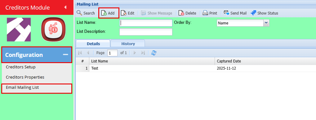 Creditors> Configuration> Email mailing List