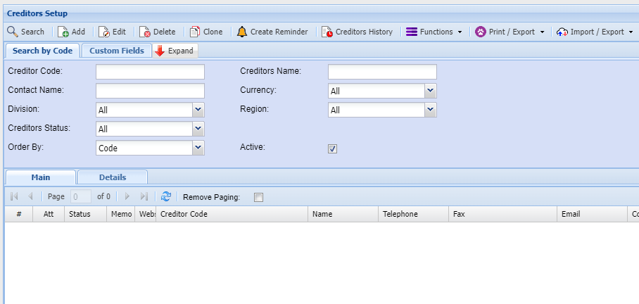 Basic Search Tab - if the creditor’s code in the basic search fields and other fields are left blank, this will bring back all the creditor’s listed in the system sorted alphabetically. If the cursor is placed on Name at the column head, this will sort the names A-Z or Z-A as preferred.