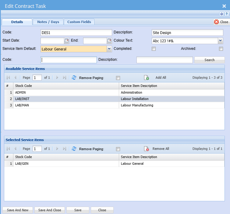 | Selected Service Items Grid | These are the service items selected from the above list that will be available for use |