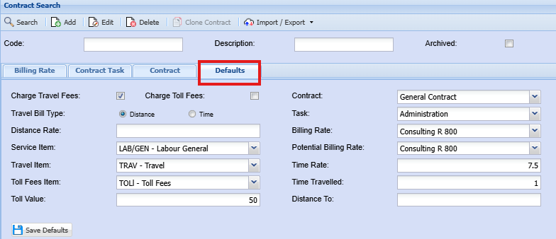 | Travel Bill Type | Sets the default to charge travel based on distance or time travelled |