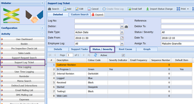 Colour indicate the font colour on the support log ticket grid for easier reading