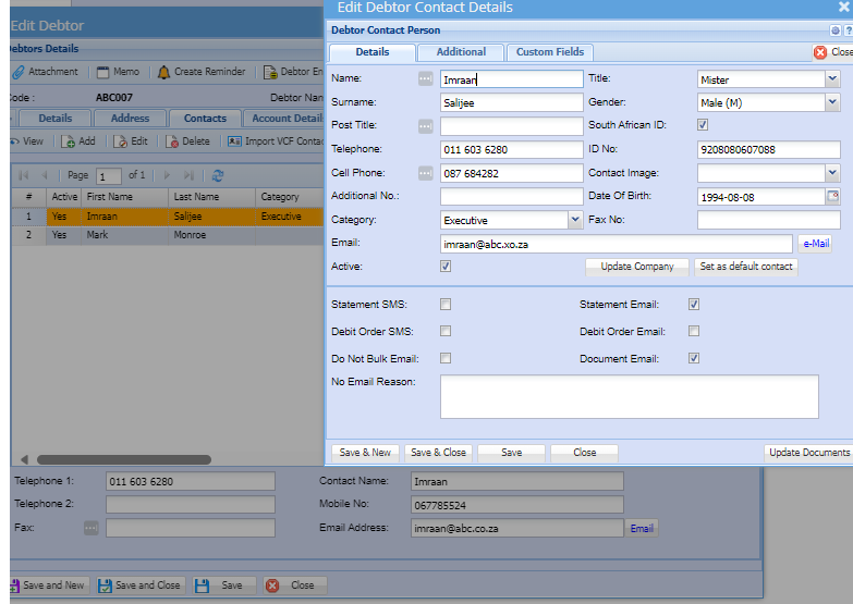 The user has to enter all essential information of a debtor or customer on this tab