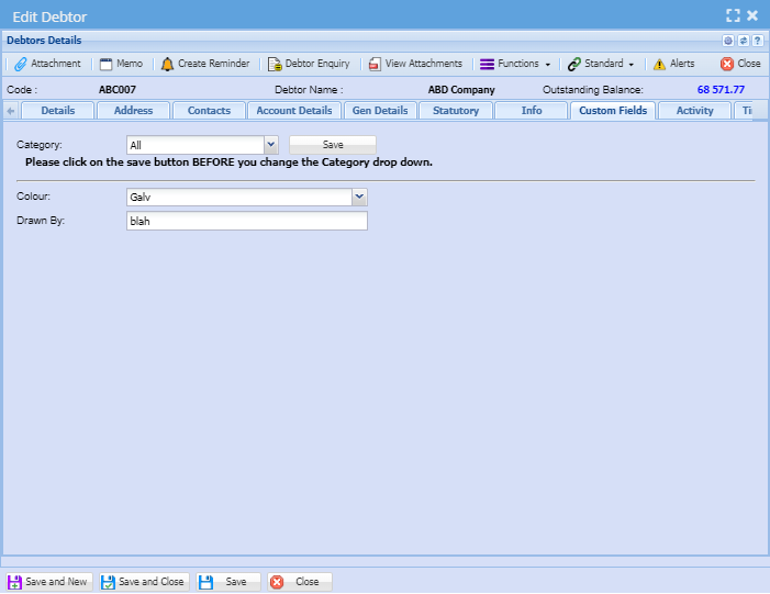 | Category | This dropdown arrow facilitates the selection process based on the debtor's or customer category based on the categories that that have been added to the dropdown. |
