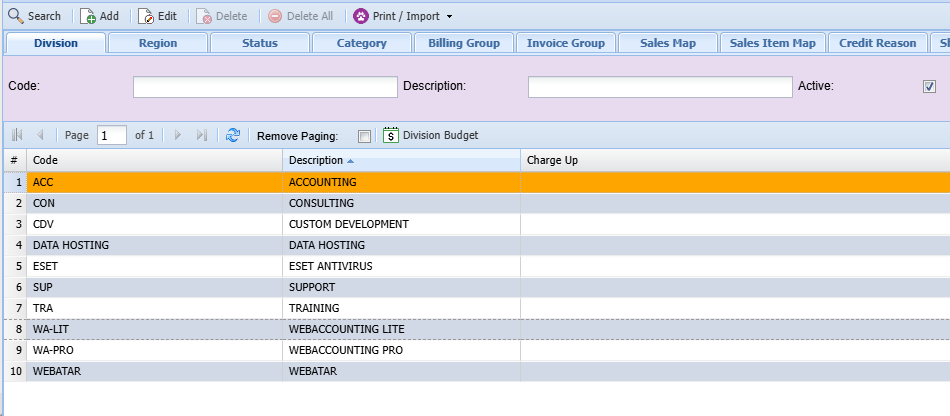| Search | Searches all the divisions either by code or description. |