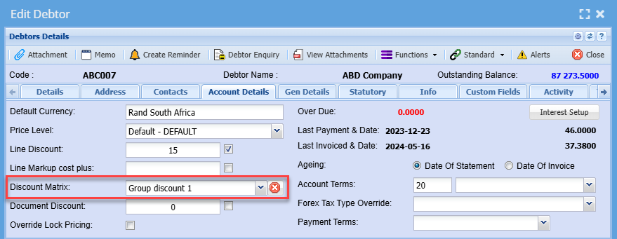 Debtors Module> Configuration> Debtor Setup> Account Details Tab
