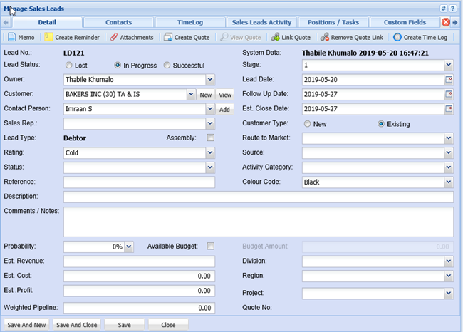 Create Sales Lead Allows you to easily create a sales lead from a debtor or customer screen if they want more business or services without having to recapture all information that already exisit within the system.