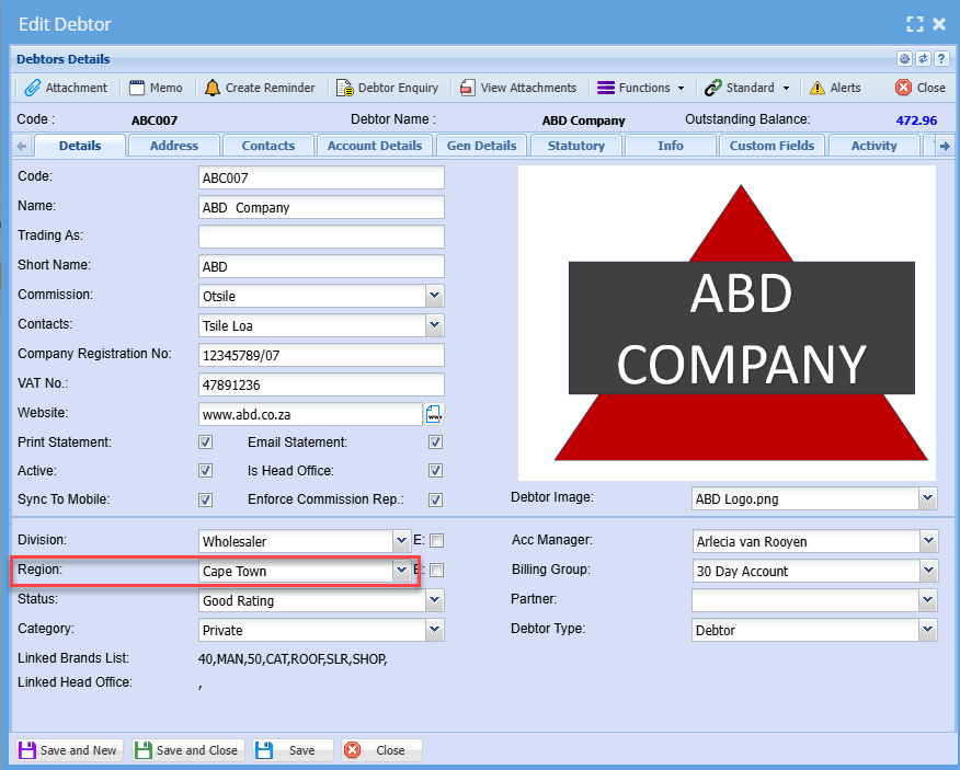 Should you now wish to set default Divisions and Regions against the debtors, you can go to the Debtor Setup and edit the respective Debtor