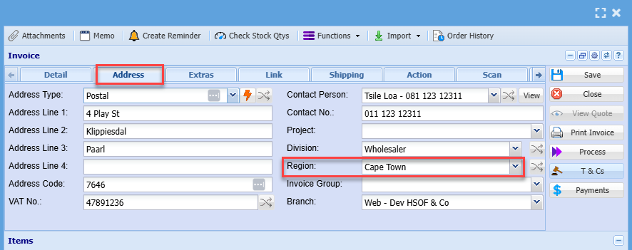 When you capture a transaction, invoice as an example, you will note the Division/ Region automatically is populated