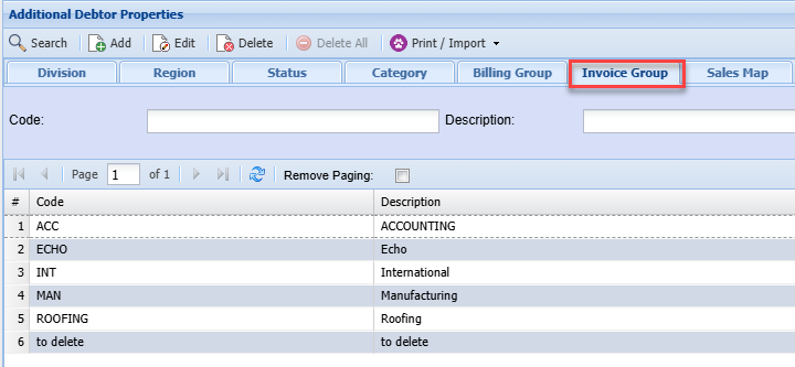 Debtors Module> Configuration> Add. Debtor Properties> Invoice Group Tab
