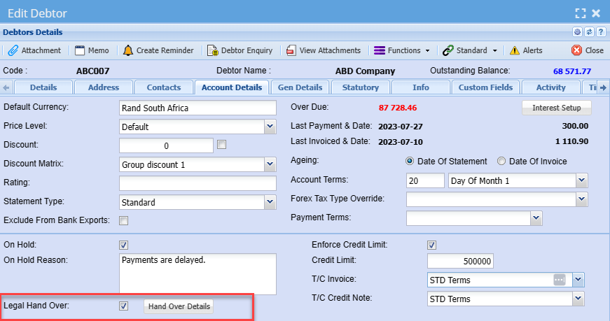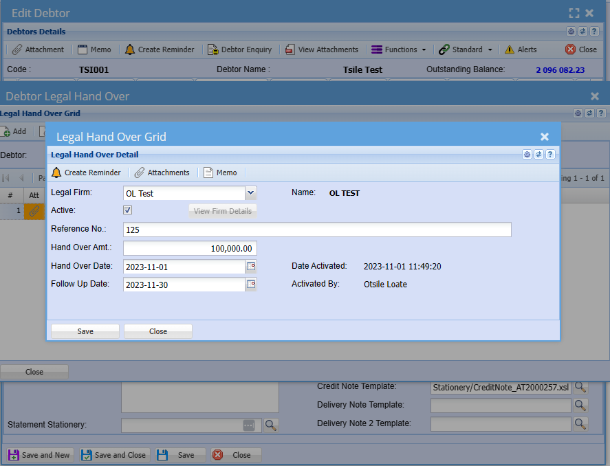This is where you complete the legal law firm details and file number for a debtor/ customer you want to handover