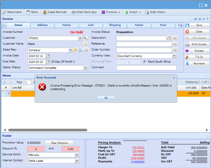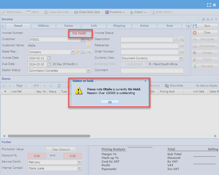 If a debtor or customer is on hold it will show on the grid and when you are creating any transaction document