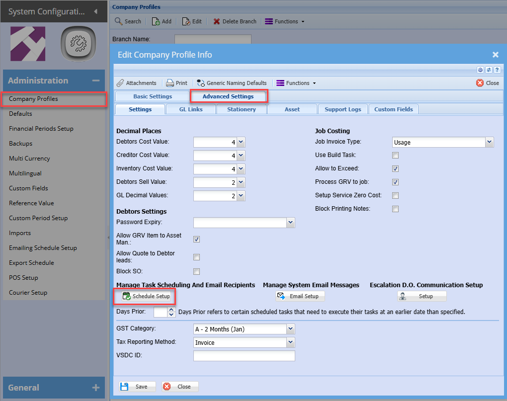 Go to System Configuration, Company Profiles, schedule setup