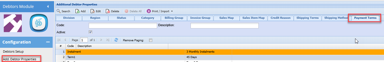 Debtors module> Configuration> Add. Debtor Properties> Payment Terms