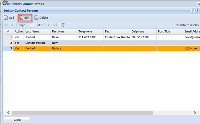 Debtors Module> Configuration> Debtors Setup> Edit Debtor> Contact Person> Add