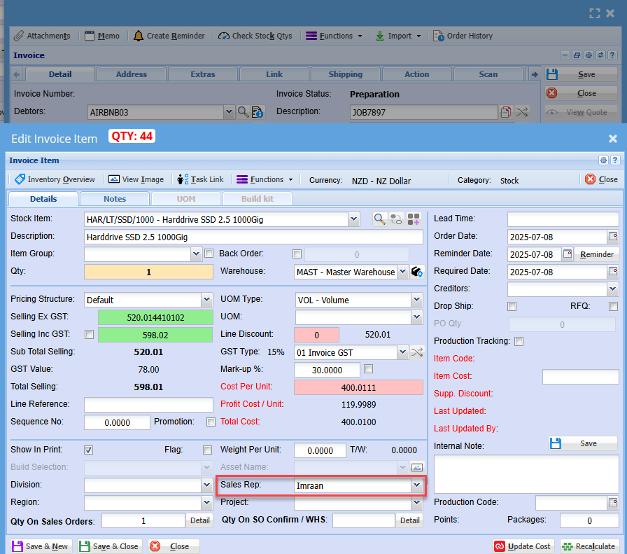 Sales document will check customer, stock item on the group and then override the sales rep on the Item line