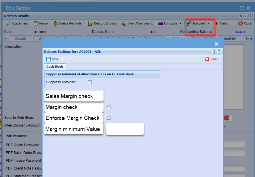 | Debtor Settings | Allows a user to tick a tick to suppress the autoload of allocations line on GL cash book |