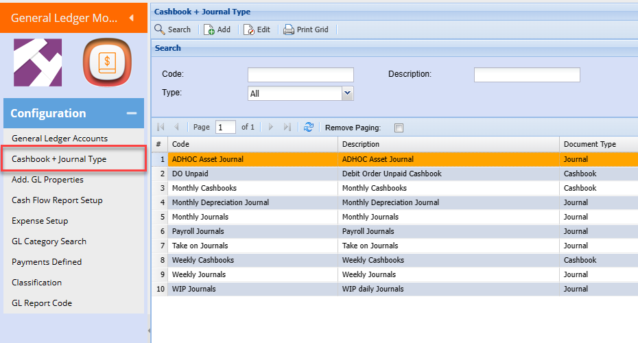 This form allows the user to search, group and filter for a journal or cashbook type
