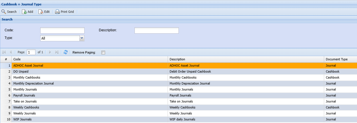 This form allows the user to search or Add for a journal or cashbook type