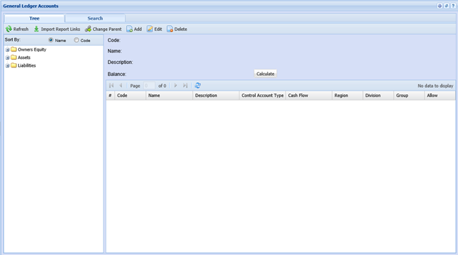 Setup General Ledger accounts in both the Tree view and Search tabs