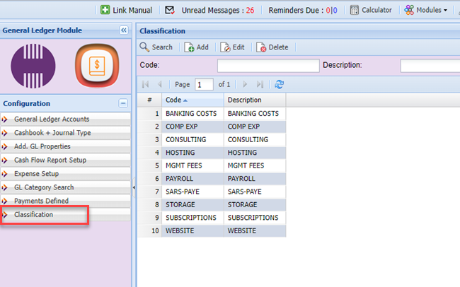 GL Classification Menu