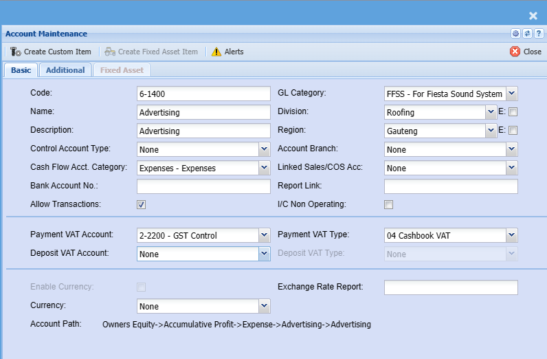 | Create Fixed Asset Item | Click this button to create a fixed asset item that will be linked to this ledger account when creating supplier invoices GRV. Only active when GL account is a fixed asset. |