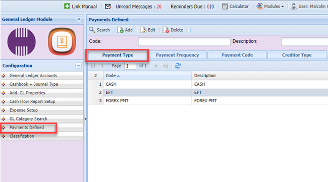 Setup the Payment Types for the Creditors and GL accounts