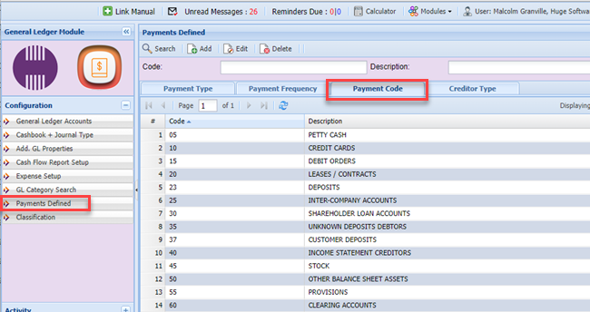 Setup the payment codes in the system