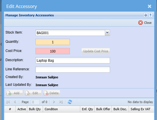 In this area we cater for multiple suppliers to one inventory item. This is handy so you can see what the cost price is that you purchase this item from the various suppliers. You will also be able to see the supplier item code and when the last time any changes done to this supplier was made.