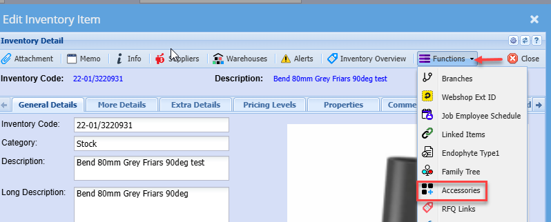 AccessoriesShows the warehouses associated with that Inventory Item