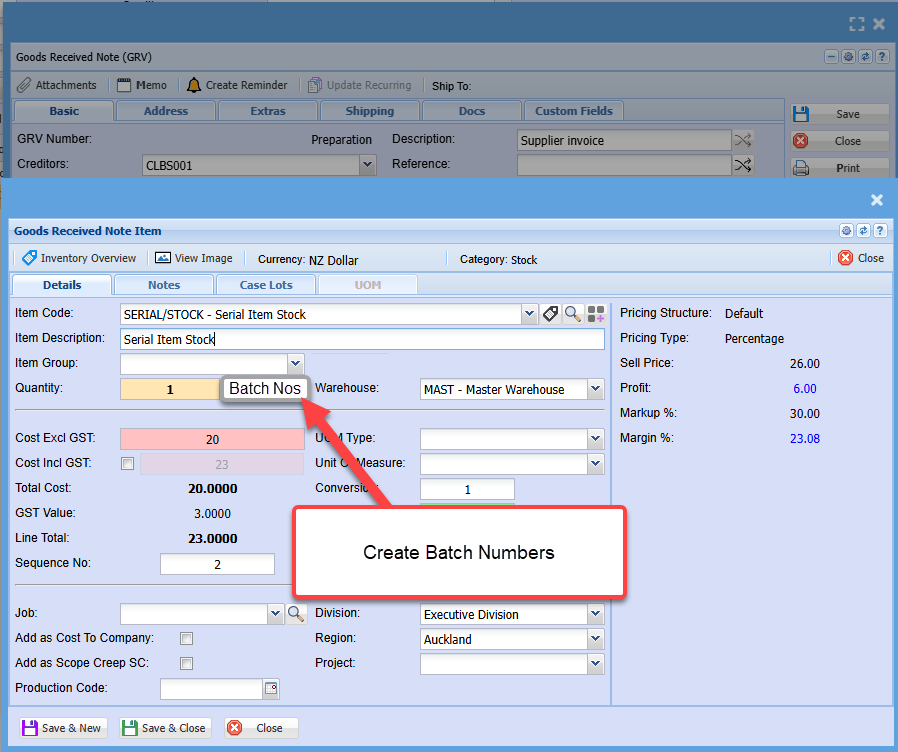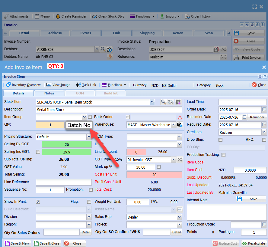 If multiple batches are selected from multiple warehouses then a warning will pop up to say that you have selected from multiple warehouses and that this will create multiple document lines with different warehouses. After the window closes, it saves the item and closes the add line item window.