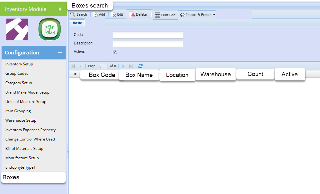 Setup boxes that will be linked to a location which in turn is linked to a warehouse