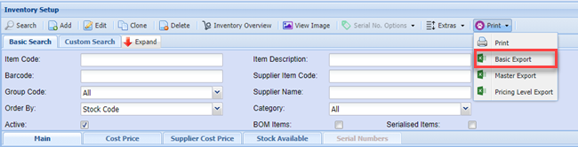 This function is used to export the master inventory data out the system.