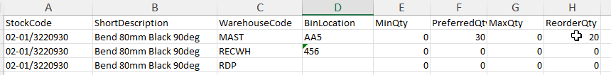 The function of this window is to bulk import stock item bin locations as well as minimum, maximum, preferred and reorder quantities.
