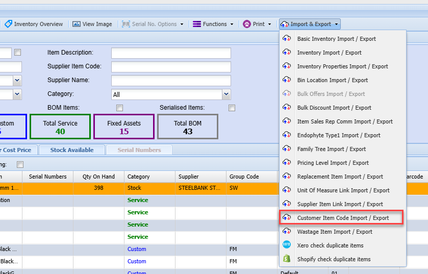 Once the list of items is returned on screen, click the Import & Export Drop down