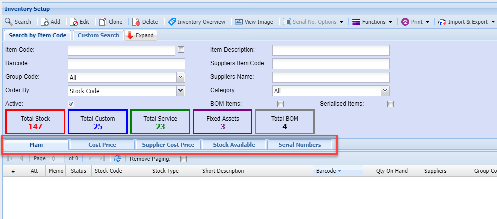 | Custom Search tab | if you have setup custom fields in your inventory, you can search for the items in this area. |
