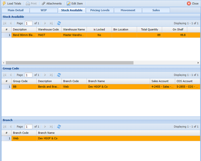 | Main Detail | Shows summary of movements for select item code |