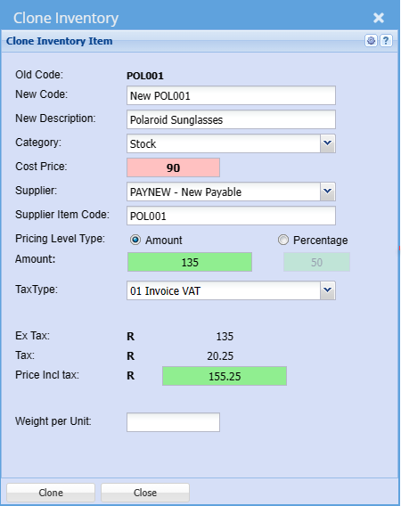 | Clone | Allows you to Clone an existing Inventory Item, Creditor or Debtor depending on the module you are in |