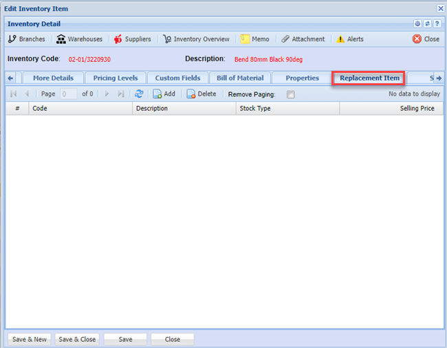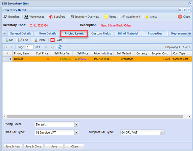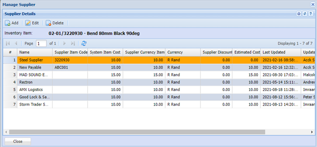 In this area we cater for multiple suppliers to one inventory item. This is handy so you can see what the cost price is that you purchase this item from the various suppliers. You will also be able to see the supplier item code and when the last time any changes done to this supplier was made.