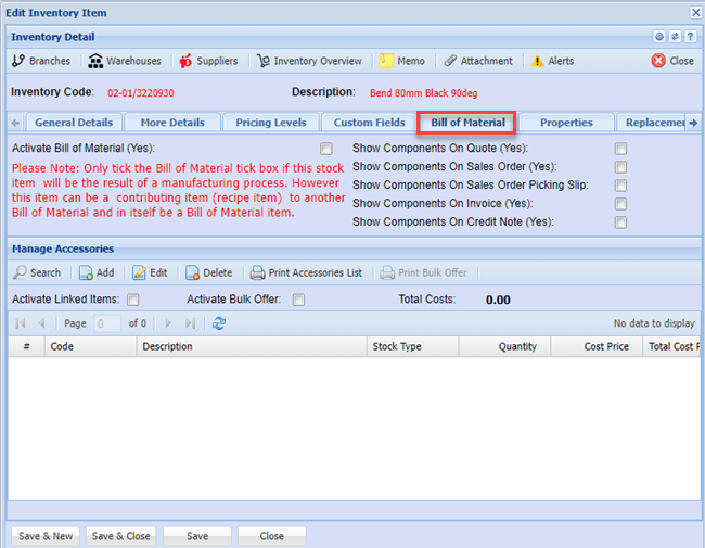 Activate bill of material - Please Note; only tick the Bill of Material box if this inventory item will be the result of a manufacturing process. However this item can be a contributing item (recipe item) to another Bill of Material and in itself be a Bill of Material item.