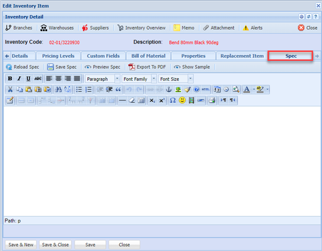 | Save Spec button | to save specs |