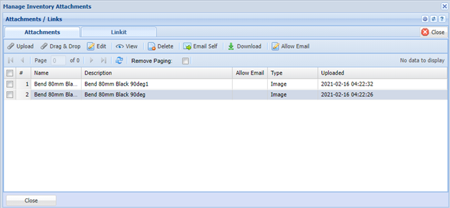 In this window we allow for unlimited amount of uploads of documents to be attached to the Inventory item. You can attach pictures, Excel sheets, Word Documents and any file you wish.