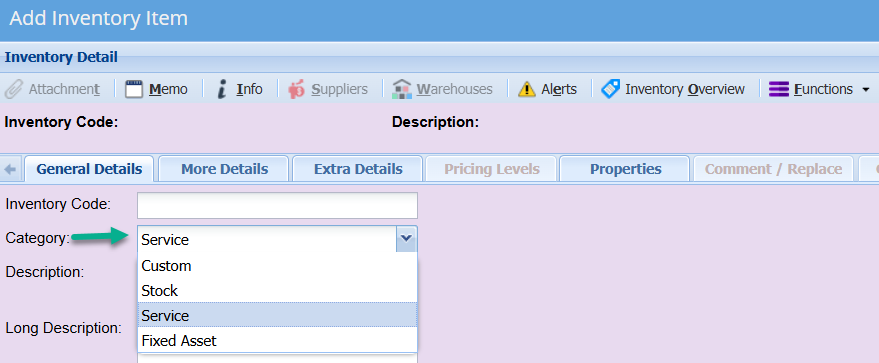 This is typically used for services related items such as labour, consulting, deliver, training, etc. note, if an item is setup as a Service item, then it will not be visible on creditors module or documents such a purchases order or GRVs |