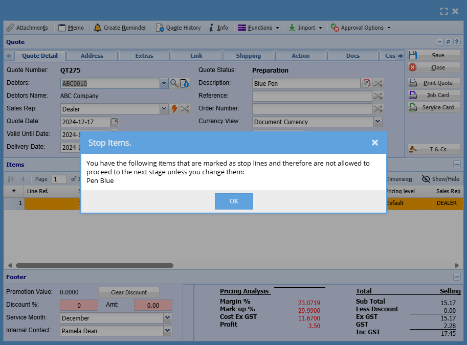 Warning message will come up to tell you which items have a Stop line against them