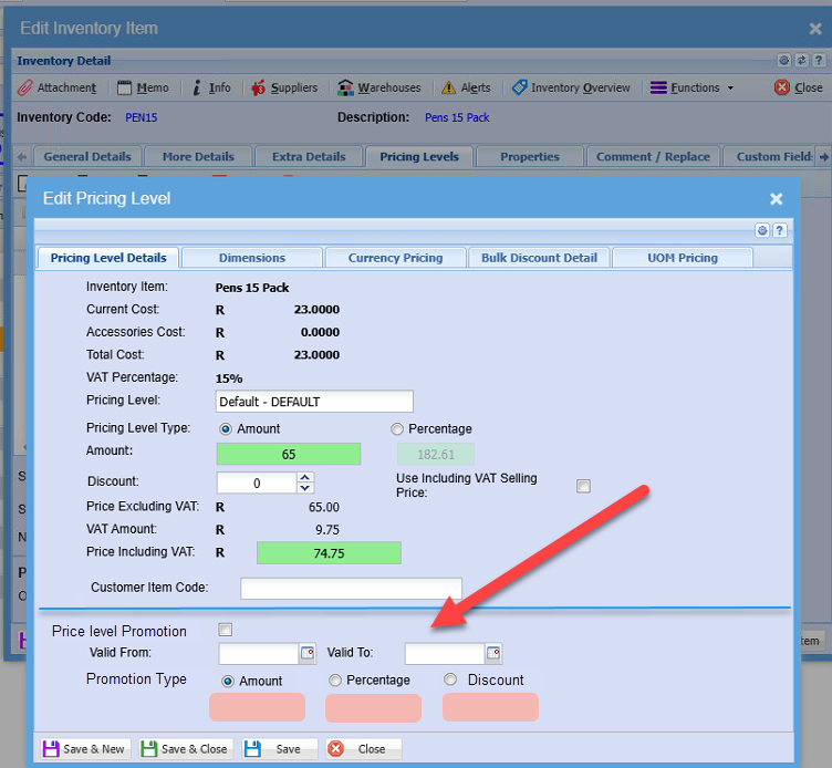 Pricing level promotion can be activated for a date from and date to period.