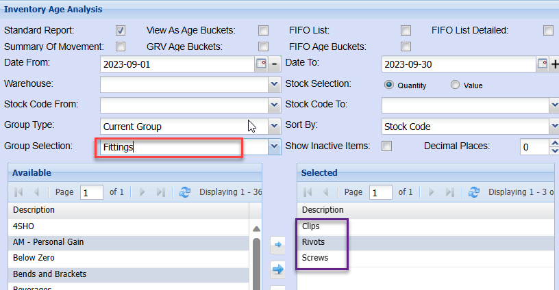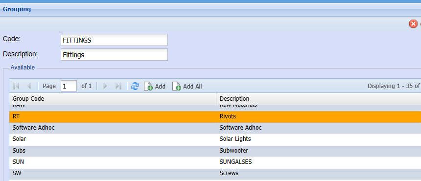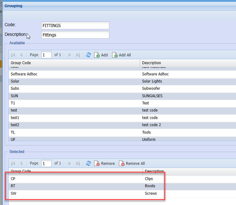 To link group codes, double click on the required group code in the top grid, this will then move to the bottom selected grid.