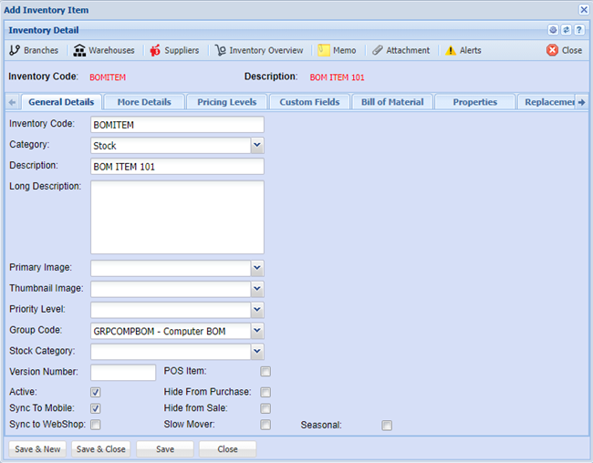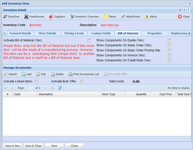 Click the Bill of Material tab